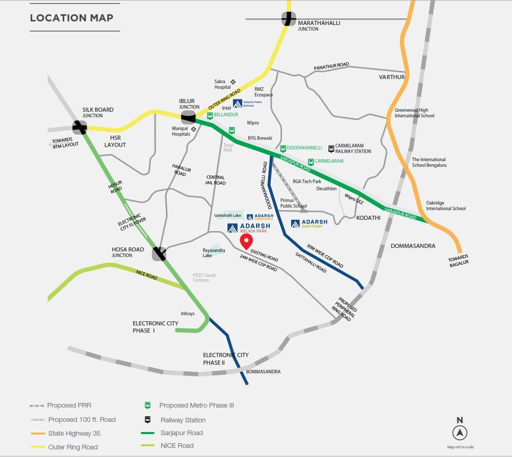 Adarsh Welkin Park is located off Sarjapur Road, near Hosa Road, Bangalore, offering excellent connectivity to IT hubs, schools, hospitals, and shopping centers.