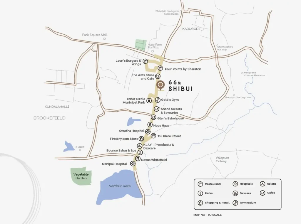 Assetz 66 and Shibui is strategically located on Whitefield Main Road, Sathya Sai Layout, one of Bangalore East’s most sought-after residential and IT hubs. The area offers excellent connectivity to key landmarks and transit points, making it convenient for daily commuting and city living.