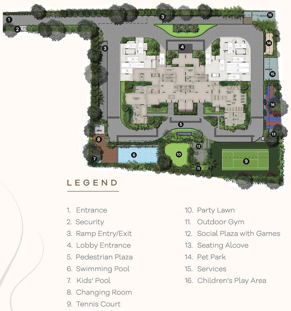 Residents can enjoy a swimming pool, gymnasium, clubhouse, lounge, yoga/meditation area, children’s play area, indoor games, pet park, senior citizen sitout, lawn tennis court, multipurpose hall, party lawn, and conference room.