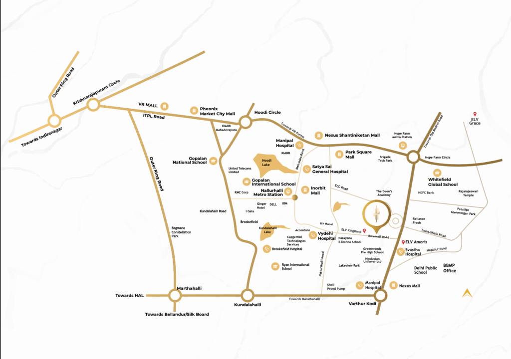 Nestled off Whitefield Main Road near ITPL, ELV Ivory Terraces enjoys a highly strategic location in the heart of Bangalore’s prime IT corridor. The project offers seamless access to key destinations such as Marathahalli, Kadugodi, and Outer Ring Road, making it an ideal choice for working professionals and families alike.