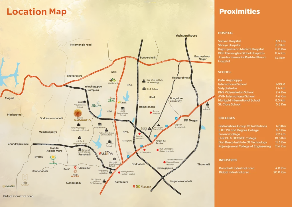 KNS Sumedha is strategically located in Margondanahalli, Bangalore East, offering excellent connectivity to key parts of the city. The project lies close to main arterial roads and public transport hubs, making commuting convenient for residents.