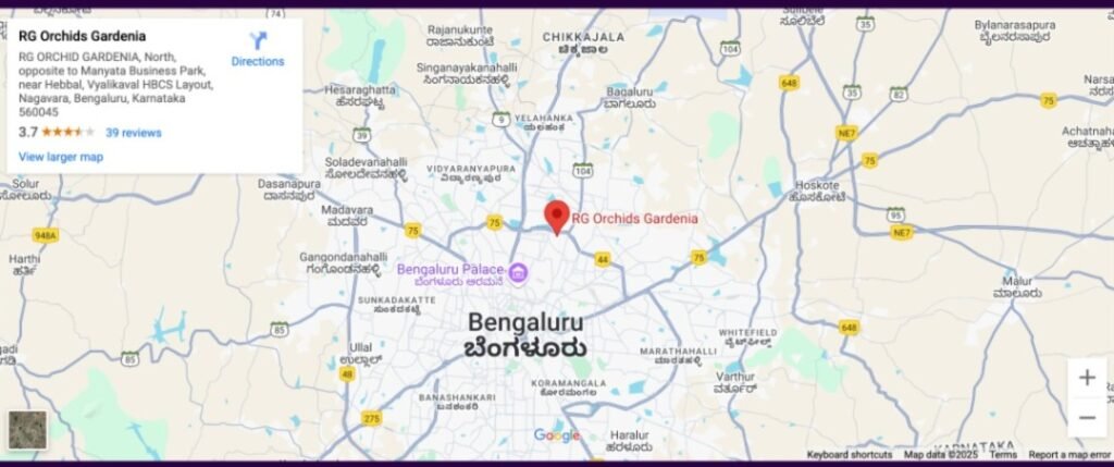 RG Orchid Gardenia is located in Nagavara, near Hebbal, Bangalore, right opposite Manyata Tech Park, offering excellent connectivity to major IT hubs, schools, and healthcare facilities.