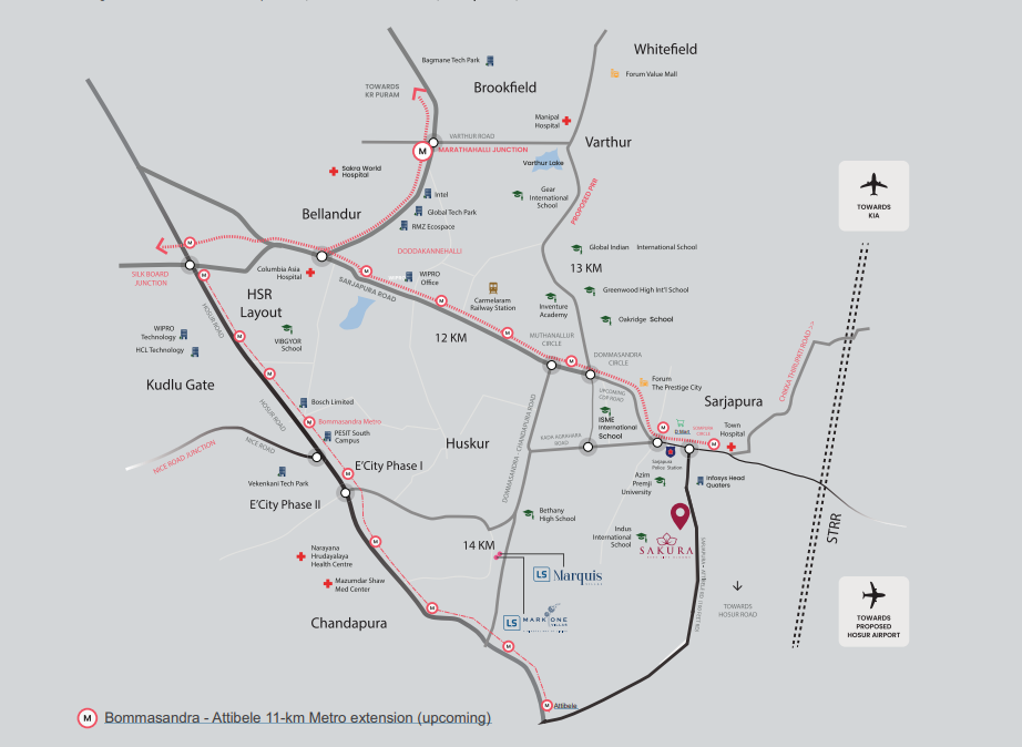 LS Sakura is strategically located on Sarjapur-Attibele Road, Bangalore, offering residents a perfect blend of connectivity, convenience, and serene living. The project is close to IT hubs, industrial areas, schools, hospitals, and lifestyle destinations, making it ideal for modern families and working professionals.