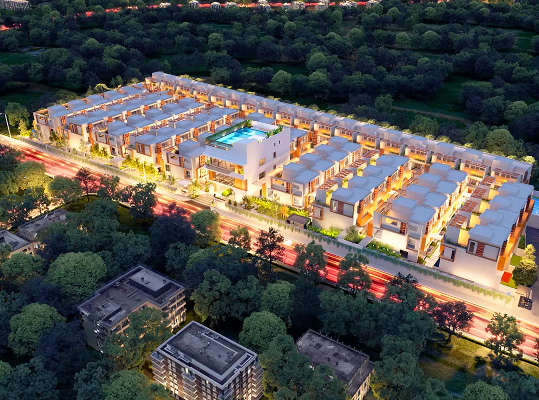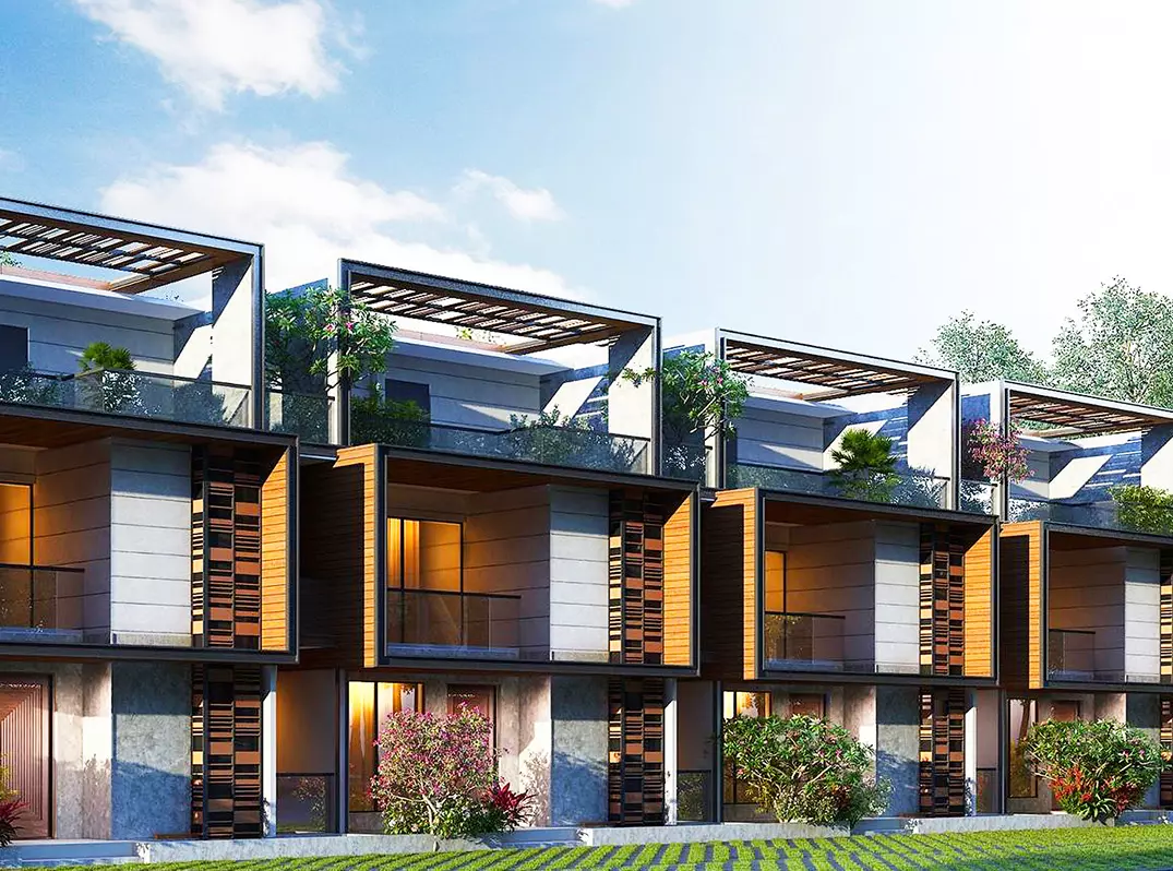 The project offers luxurious 4 BHK triplex row houses ranging from 3,255 to 3,260 sq ft with private terraces and backyards.