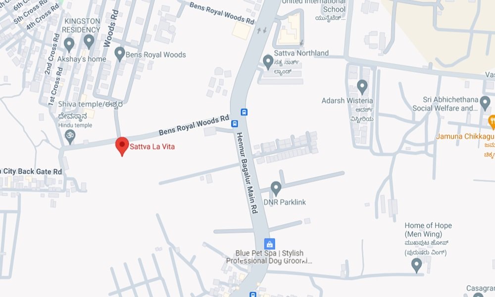 Sattva La Vita is located off Hennur Main Road, near Bhartiya City in North Bangalore, offering excellent connectivity and convenience.