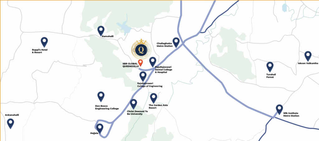 Situated in Kumbalgodu, off Mysore Road, Bangalore South, SBR Global Queens Ville enjoys a strategic location in one of the city’s fastest-growing corridors. The project benefits from seamless connectivity to Mysore Road, NICE Road, and other arterial routes, making daily commutes smooth and hassle-free.