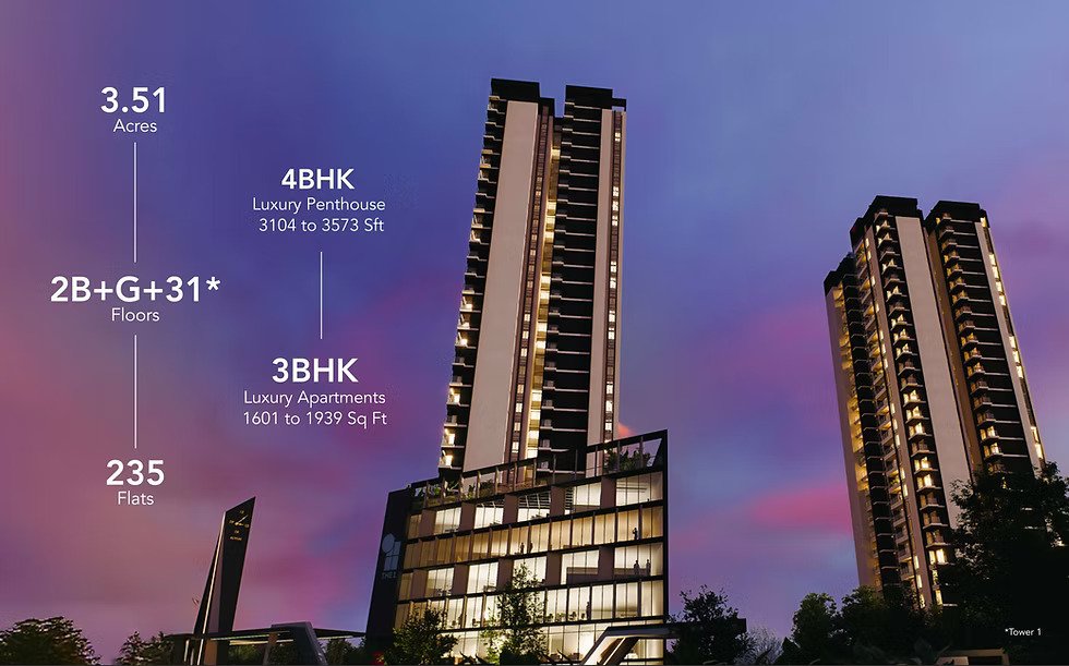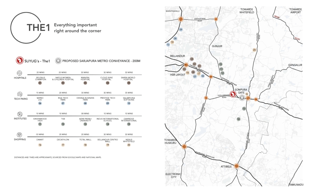 Suyug The 1 is a luxury high-rise residential apartment project by Suyug Infra, located near Sompura Gate on Sarjapur Road, Bangalore. Spread across 3.51 acres, this landmark development features two 31-storey towers with a total of 235 premium 3BHK and 4BHK apartments. Positioned as the tallest residential project in the Sarjapur region, it offers a blend of luxury, comfort, and sustainability. The project includes a vast 65,000+ sq. ft. clubhouse, swimming pool, gymnasium, jogging track, children’s play area, and landscaped gardens. With a focus on eco-conscious living, it incorporates features like rainwater harvesting, optimized natural lighting, MIVAN-based seismic-resistant construction, and 82% open space, and has earned IGBC pre-certification. Suyug The 1 is RERA registered (PRM/KA/RERA/1251/310/PR/051224/007268) and is expected to be ready for possession by December 2027. Its strategic location ensures excellent connectivity to Whitefield, Electronic City, the Outer Ring Road, and other key areas in East Bangalore.